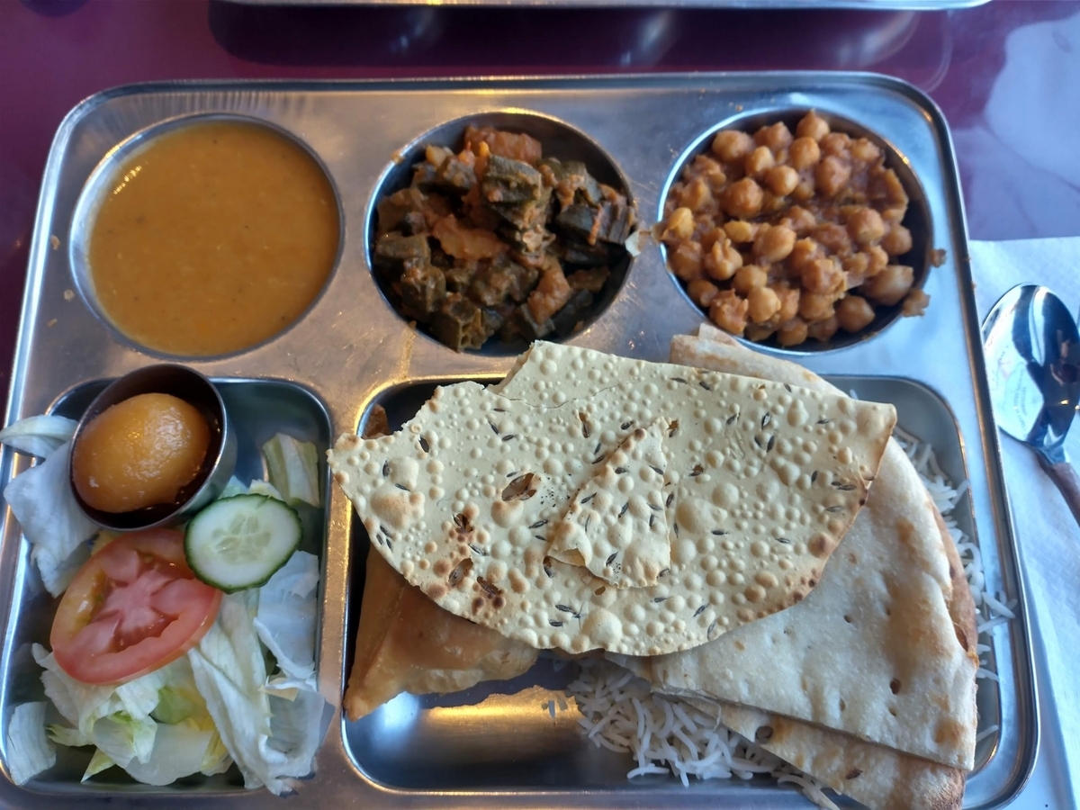 店の人によると、前日やっと電気が通ったとかで、ヴィーガン・タリはいつもならチャパティですが、生地が準備できてないのでナンで良いですか、と。