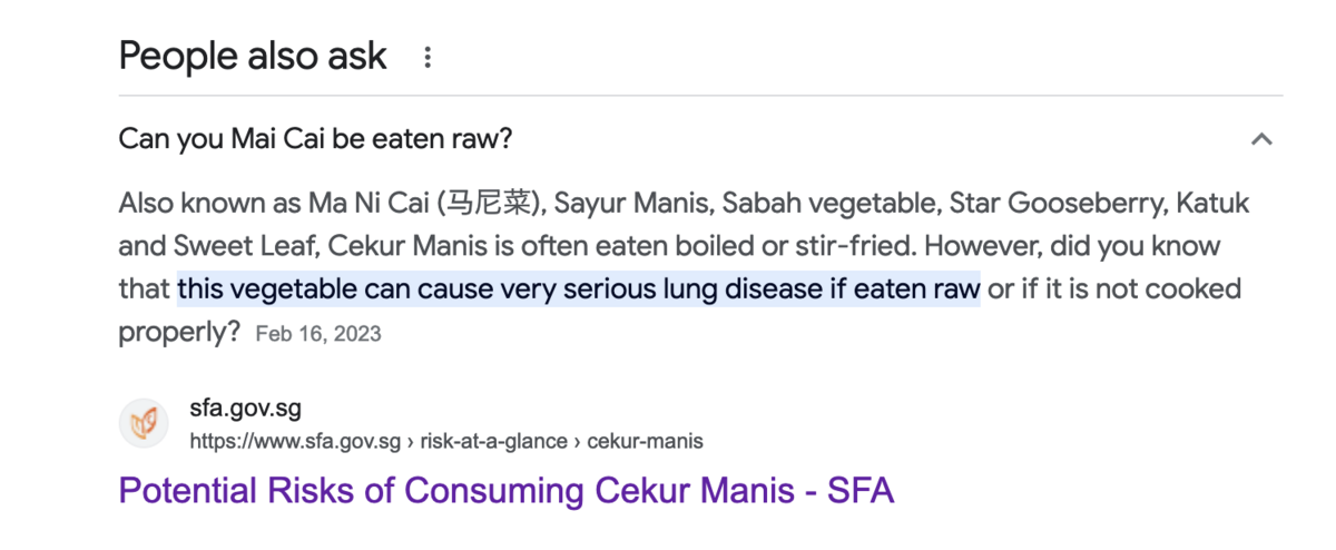 本当にそんな野菜があるのか不思議なんですが、写真検索で引っかかった野菜(You Mai Cai)は、生で食べると肺を蝕むことがありうるらしく、死にいたることもあるとかなんとか。